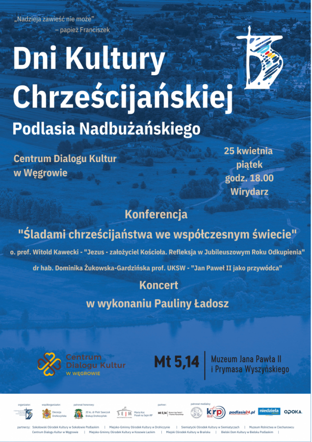 Centrum Dialogu Kultur oraz Muzeum Jana Pawła II i Prymasa Wyszyńskiego w Warszawie zapraszają w najbliższy piątek 25 kwietnia o godz. 18.00 na Konferencję "Śladami chrześcijaństwa we współczesnym świecie". Będziemy gościli o. prof Witolda Kaweckiego oraz prof. Dominikę Żukowską-Gardzińską. Podczas konferencji odbędzie się także koncert w wykonaniu Pauliny Ładosz. Wydarzenie jest organizowane w ramach Dni Kultury Chrześcijańskiej Podlasia Nadbużańskiego.