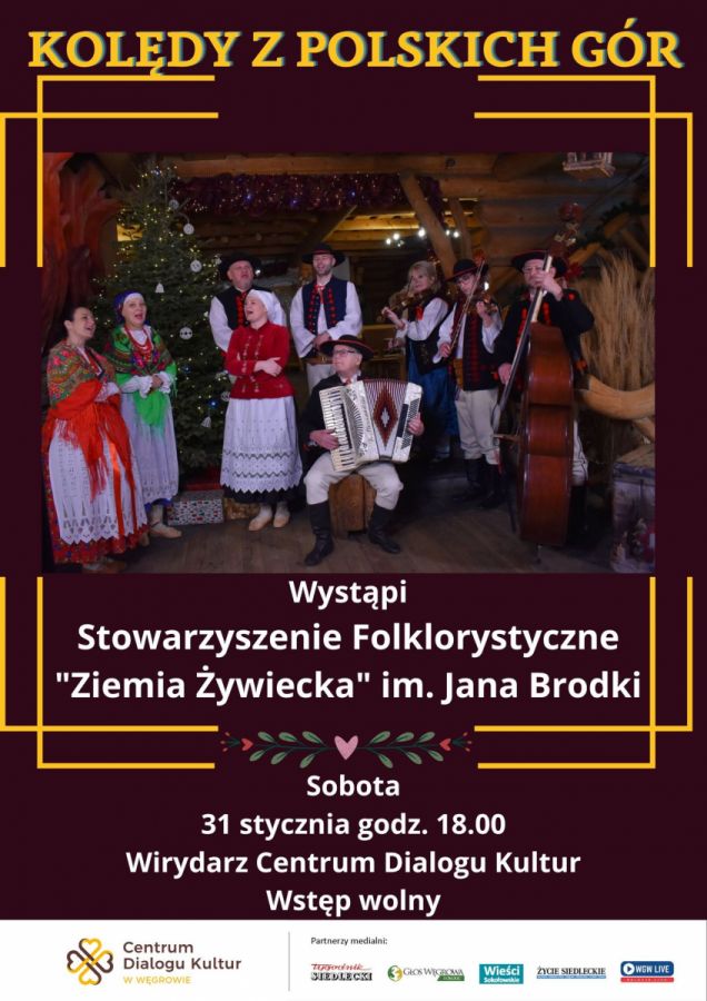 Serdecznie zapraszamy 31 stycznia o godz. 18.00 na koncert pt. „Kolędy polskich gór” w wykonaniu artystów ze Stowarzyszenia Folklorystycznego „Ziemia Żywiecka” im. Jana Brodki. Podczas koncertu na zakończenie tradycyjnego śpiewania kolęd usłyszymy góralską ludową nutę.