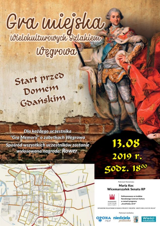 13 sierpnia odbędzie się Gra Miejska - "Wielokulturowym szlakiem Węgrowa". Start o godz. 18.00 przed Domem Gdańskim. Taka forma spędzania czasu w wielu miastach jest coraz bardziej popularna. Jest doskonałą formą wspólnego spędzenia czasu, a także może przynieść dużo satysfakcji i pozytywnych emocji. Podczas wspólnej zabawy będzie możliwość odkrycia kilku tajemnic związanych z historią Węgrowa. Gra polega ona na odwiedzeniu kilku wyznaczonych miejsc w mieście, gdzie patrole przydzielą zagadki i będzie trzeba odnaleźć ukryte litery, które wpisuje się do kart, z nich z kolei powstanie hasło. Dla każdego uczestnika jest przewidziana gra memory o zabytkach naszego miasta. Spośród wszystkich, którzy sprostają zadaniu zostanie wylosowana nagroda główna: Rower! Serdecznie zachęcam do wzięcia udziału! Wydarzenie zostało dofinansowane ze środków Narodowego Centrum Kultury w ramach programu "Etno Polska 2019".