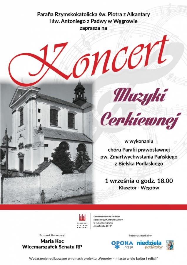 Po powstaniu styczniowym część naszego klasztoru została przebudowana na cerkiew prawosławną, która funkcjonowała do 1918 roku. Nawiązując do przeszłości pragniemy przybliżyć mieszkańcom Węgrowa element religii prawosławnej. Nieodłącznym elementem sprawowanej liturgii jest śpiew oraz muzyka. W njabliższą niedzielę 1 września o godz. 18.00 w naszej parafii będziemy gościli chór z prawosławnej parafii Zmartwychwstania Pańskiego z Bielska Podlaskiego. Spotkanie z kulturą Kościoła wschodniego, poprzez śpiew cerkiewny może być okazją do poznania w jakim duchu przeżywają Eucharystię wyznawcy Prawosławia. Podczas koncertu odbędzie się prelekcja o muzyce cerkiewnej. Wydarzenie jest realizowane w ramach projektu "Węgrów - miasto wielu kultur i religii" dofinansowanego ze środków Narodowego Centrum Kultury w ramach programu "Etno Polska 2019".