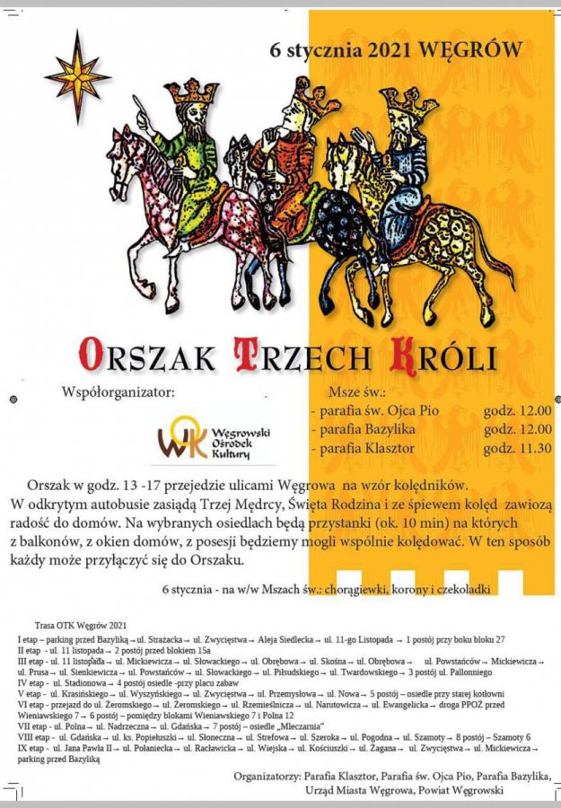 W roku 2021 Orszak przyjedzie do Państwa domów. Ulicami Węgrowa w odkrytym białym autobusem jelcz cabrio tzw „ogórek”, na wzór kolędników, przejadą Trzej Mędrcy, Święta Rodzina, gwiazdor z Gwiazdą i ze śpiewem kolęd zawiozą radość do domów. Na większych osiedlach będą krótkie przystanki ok 10 min. Z balkonów, z okien, z posesji zapraszamy do wspólnego kolędowania. W ten sposób każdy może się przyłączyć do Orszaku Trzech Króli. Aby lepiej świętować to wydarzenie 3 stycznia w kościołach będą wyłożone śpiewniki, a 6 stycznia na Mszy św. o godz. 12 chorągiewki, korony i czekoladki.