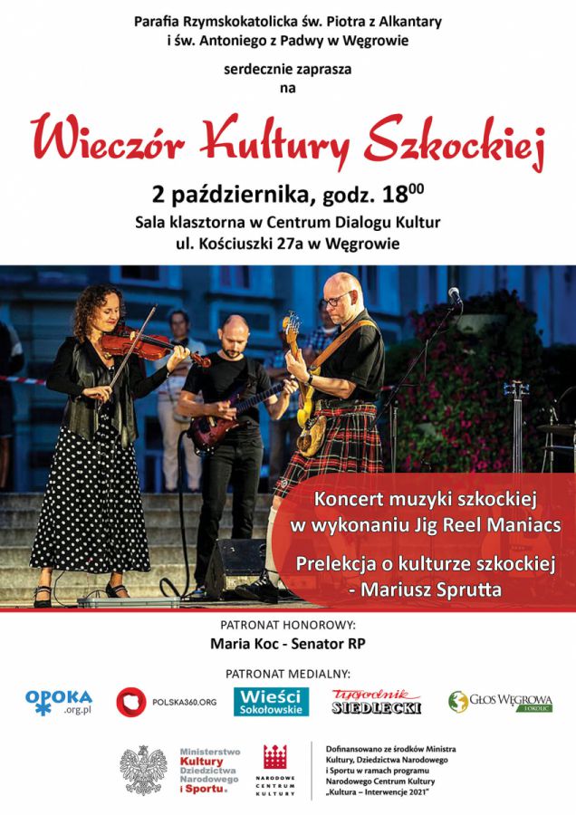 Za tydzień w sobotę o godz. 18.00 na sali klasztornej w Centrum Dialogu Kultur "Wieczór Kultury Szkockiej". Podczas wydarzenia odbędzie się koncert muzyki szkockiej w wykonaniu Jig Reel Mniacs przeplatany prelekcją o tej kulturze i muzyce. Wydarzenie nawiązuje do historii Węgrowa, kiedy to w XVII i XVIII wieku Szkoci byli częścią życia i kultury Węgrowa. Szkotów sprowadził do miasta ówczesny właściciel miasta - książę Bogusław Radziwiłł. Zajmowali się oni głównie tkactwem. Wyrabiane przez nich sukno było słynne w całej Rzeczypospolitej. Widomym znakiem obecności Szkotów w Węgrowie są nagrobki na cmentarzu ewangelickim.