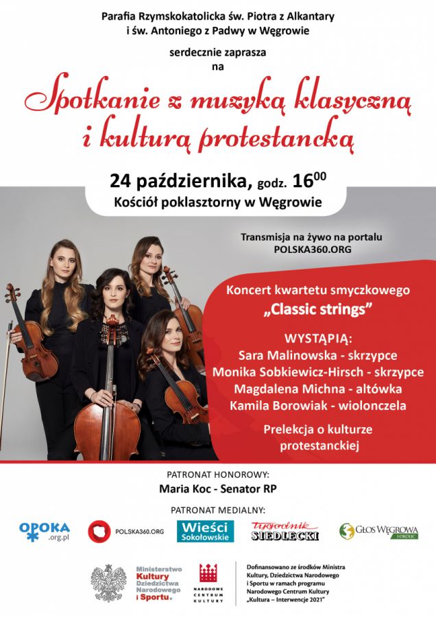 Za tydzień w niedzielę o godz. 16.00 po zakończonej Eucharystii zapraszamy na spotkanie z muzyką klasyczną oraz kulturą protestancką. Podczas wydarzenia odbędzie się koncert kwartetu smyczkowego "Classic strings", który zaprezentuje utwory muzyki klasycznej oraz filmowej. Wydarzenie nawiązuje do historii Węgrowa, kiedy to od XVI wieku społeczność wyznania protestanckiego zamieszkuję nasze miasto. Do dnia dzisiejszego zachowały się dwa zabytki: drewniany kościółek z XVII w., wokół którego znajduje się cmentarz z unikalnymi nagrobkami szkotów oraz świątynia z XIX wieku. W tym kościele wybudowanym w stylu klasycystycznym znajdują się wysokiej klasy organy, które wykonał wrocławski organmistrz Maritz Robert Muller.