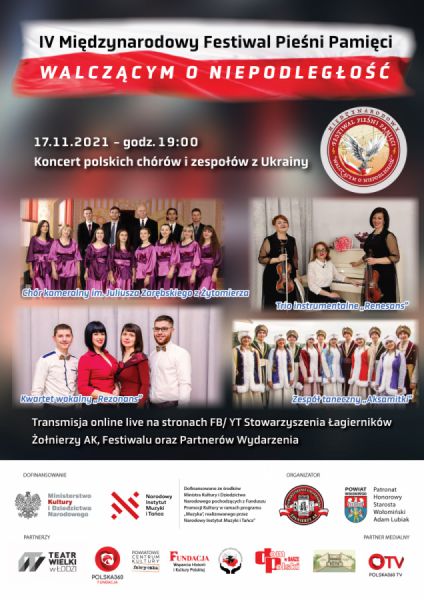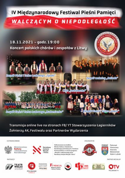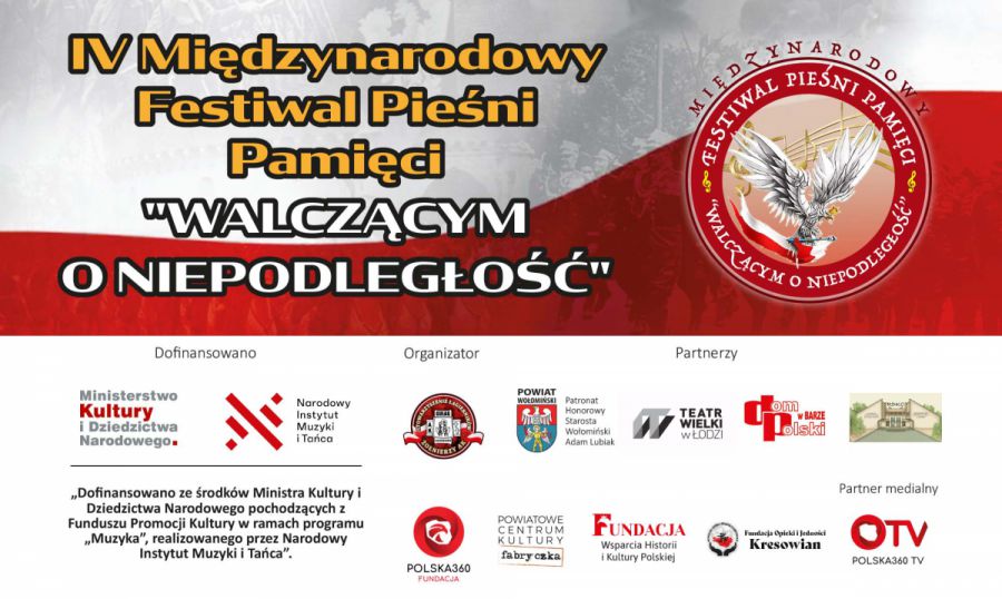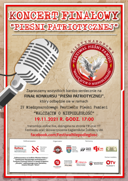 W imieniu głównego organizatora Stowarzyszenia Łagierników Żołnierzy Armii Krajowej pragniemy wszystkich zaprosić na IV Międzynarodowy Festiwal Pieśni Pamięci „Walczącym o Niepodległość”, będący kontynuacją trzech poprzednich jego edycji w latach 2017-2019.