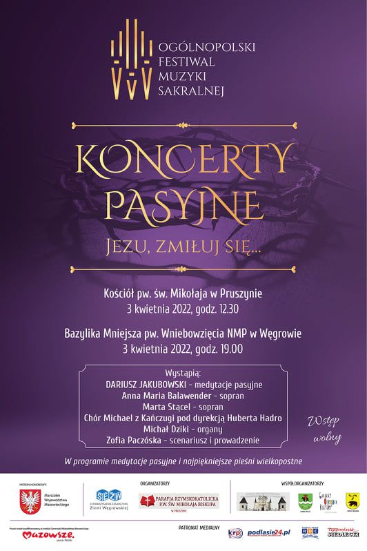 W imieniu Organizatorów, Artystów i Mecenasów Kultury serdecznie zapraszamy na koncerty inaugurujące Ogólnopolski Festiwal Muzyki Sakralnej. Wystąpią:Marek Chomiuk, Kuba Plas, Iza Kuniewicz, Dariusz Jakubowski, Hubert Hadro, Anna Maria Balawender, Marta Stącel, Michał Dziki, Michał Kozłowski, Chór Michael.
