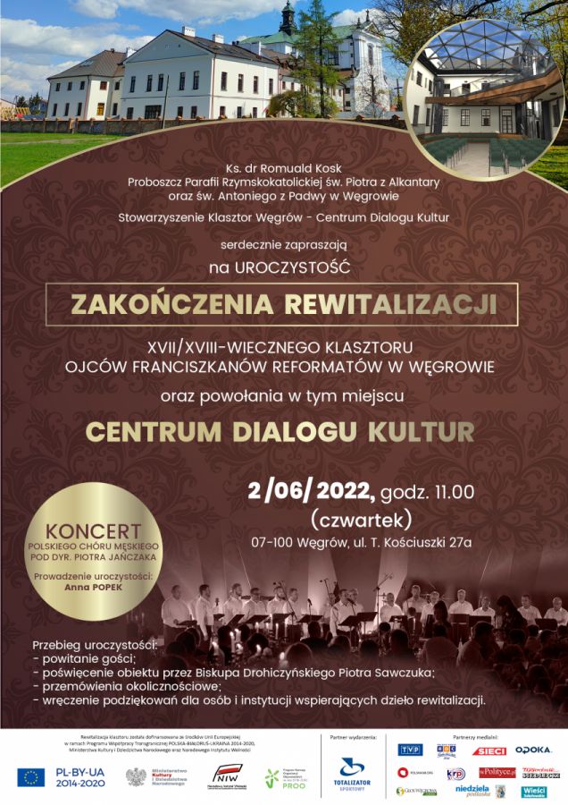 Uroczystość rozpocznie o godz. 11.00 poświęceniem klasztoru i wystąpieniem Biskupa Drohiczyńskiego ks. dr. Piotra Sawczuka. Szczególną atrakcją tego dnia będzie koncert Polskiego Chóru Męskiego pod dyr. prof. Piotra Jańczaka. Będzie to pierwszy występ w zrewitalizowanym wirydarzu klasztornym inaugurujący działalność zlokalizowanej w nim nowej sali wielofunkcyjnej. Rewitalizacja rozpoczęła się od 2019 r. w ramach Programu Współpracy Transgranicznej Polska-Białoruś-Ukraina 2014-2020 dofinansowanego ze środków Unii Europejskiej. Wkład własny do projektu został dofinansowany ze środków Ministerstwa Kultury i Dziedzictwa Narodowego w ramach programu Promesa dla Kultury, Narodowego Instytutu Wolności w ramach programu PROO 1b-dotacje na wkład własny, Ministerstwa Spraw Zagranicznych w ramach programu „Dyplomacja Publiczna – 2021”. Część przeprowadzonych prac to były koszty niekwalifikowane, które zostały dofinansowane ze środków Powiatu Węgrowskiego oraz Miasta Węgrów.