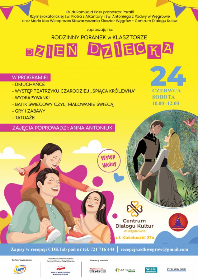 w Centrum Dialogu Kultur. Spotkanie zatytułowane „Dzień Dziecka” niesie za sobą dużo atrakcji dla najmłodszych i ich rodziców. Organizatorzy zapraszają na występ teatrzyku „Śpiąca królewna” następnie prowadząca spotkanie Anna Antoniuk zaprosi do gier i zabaw jak również pokaże, jak zrobić zwierzaka z balonów oraz zaprezentuje i nauczy malowania świecą tzw. Batik świecowy. Podczas całego spotkania do dyspozycji dzieci będą dmuchane zjeżdżalnie.