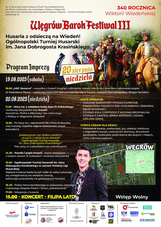 Zapraszamy całe rodziny 20 sierpnia na III Barok Festiwal w Węgrowie, na widowisko historyczne pt. „Husaria z odsieczą na Wiedeń! Ogólnopolski Turniej Husarski im. Jana Dobrogosta Krasińskiego” w 340. rocznicę Wiktorii Wiedeńskiej. To barwne widowisko plenerowe odbędzie się na łące, która położona jest za cmentarzem, przy skrzyżowaniu ulic Łubieńskich i Glinki.