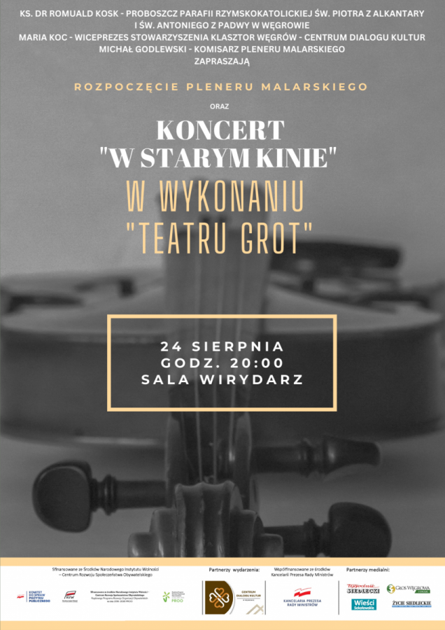 Zapraszamy do Sali Wirydarz o godz. 20.00 na rozpoczęcie międzynarodowego pleneru malarskiego, którego komisarzem jest Michał Godlewski, podczas którego odbędzie się koncert Teatru Grot pn. „W starym kinie”. Występują Kinga i Arkadiusz Głogowscy oraz Bolesław Błaszczyk – Grupa MoCarta- fortepian & wiolonczela. Koncert złożony z Niezapomnianych piosenek polskiego przedwojennego kina i kabaretu, z których każda może szczycić się mianem przeboju. Niegdyś wykonywane przez największe sławy kina takie jak: Hanka Ordonówna, Zula Pogorzelska, Eugeniusz Bodo czy Mieczysław Fogg. Piosenki wykonują Kinga i Arkadiusz Głogowscy małżeństwo aktorskie aktorzy i śpiewacy Polskich scen teatralnych i polskiego filmu, założyciele Teatru Grot w przedwojennej Willi Jeżewo, domu którego właścicielem był gen. Stefan Rowecki „Grot”. Towarzyszy im przy fortepianie wirtuoz wiolonczeli , Bolesław Błaszczyk, członek grupy MoCarta Usłyszymy min. takie utwory jak: Powróćmy jak za dawnych lat…Umówiłem się z nią na dziewiątą…Miłość ci wszystko wybaczy…Całuję twoją dłoń madame….Nieme kino.. przeplatane anegdotami z życia artystów dwudziestolecia międzywojennego.