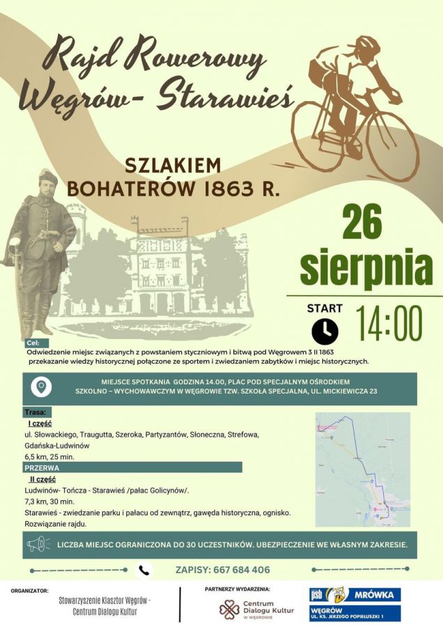 26 sierpnia (sobota) zapraszamy na Rajd Rowerowy „Szlakiem Bohaterów 1863 r.”, który wpisuje się w obchody 160. rocznicy wybuchu powstania styczniowego. W 1863 r. na terenie Węgrowa i w jego okolicach miało miejsce wiele interesujących wydarzeń. Podczas rajdu będziemy pamiętać o uczestnikach słynnych „Polskich Termopil” – bitwy 3 II 1863 r. odwiedzimy miejsce straceń polskich patriotów, pole bitwy pod Ludwinowem (2 II 1863 r.) i pałac Starejwsi.