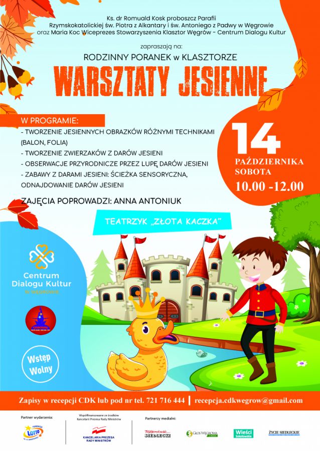Jesień to jedna z najpiękniejszych pór roku korzystając z jej uroków zapraszamy na „Rodzinny Poranek w Klasztorze”, który odbędzie się 14 października 2023 r. w godz. 10.00-12.00 w Centrum Dialogu Kultur w Węgrowie. Sobotnie spotkanie rozpocznie się występem Teatru Lalek Czarodziej „Złota Kaczka”, podczas której mali widzowie usłyszą ciekawą historię Janka i poznają jego godną naśladowania postawę. W drugiej części spotkania uczestnicy zapoznają się z różnymi technikami plastycznymi, namalują jesienne obrazy oraz będą mogli wykazać się swoją pomysłowością tworząc figurki