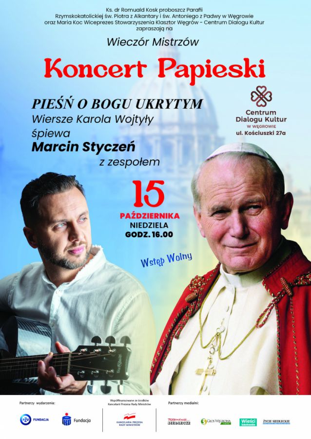 Koncert „PIEŚŃ O BOGU UKRYTYM” – wiersze Karola Wojtyły w interpretacji Marcina Stycznia. Koncert „Pieśń o Bogu ukrytym” to przebojowe, melodyjne interpretacje młodzieńczych wierszy Karola Wojtyły w wykonaniu Marcina Stycznia, który 15 października 2023 r. o godz. 16.00 wystąpi w naszej Sali Wirydarz. Koncert Papieski jest organizowany w przededniu 45. rocznicy wyboru św. Jana Pawła II na papieża. Będzie to czas pozwalający na doświadczenie głębi mistycznej duchowości, w której wzrastał nasz rodak Karol Wojtyła i którą wyraził w swojej poezji.