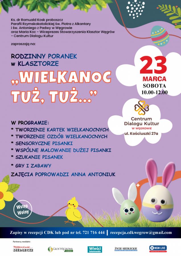 Serdecznie zapraszamy 23 marca w godz. 10:00 - 12:00 na Rodzinny Poranek w klasztorze "Wielkanoc tuż, tuż..."
