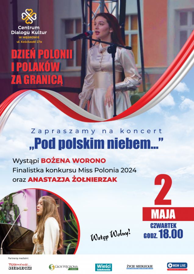 Od 2002 roku 2 maja obchodzony jest Dzień Polonii i Polaków za Granicą Święto państwowe ustanowione zostało przez Sejm RP z inicjatywy Senatu RP. W ten sposób uhonorowano osoby żyjące poza granicami Polski, które zabiegały o polską niepodległość oraz wyrażały swoje przywiązanie do Rzeczypospolitej. W tym szczególnym dniu zapraszamy do Wirydarza na koncert pt. „Pod polskim niebem…”, z udziałem Bożena Worono oraz Anastazja Żołnierzak