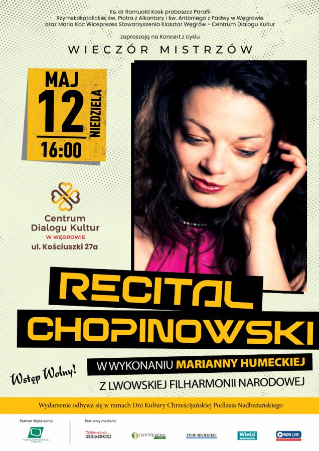 W najbliższą niedzielę 12 maja o godz. 16.00 w wirydarzu odbędzie się kolejny koncert w ramach cyklu „Wieczory Mistrzów”. Podczas tego spotkania usłyszymy „Recital Chopinowski” w wykonaniu Marianny Humeckiej z Lwowskiej Filharmonii Narodowej.