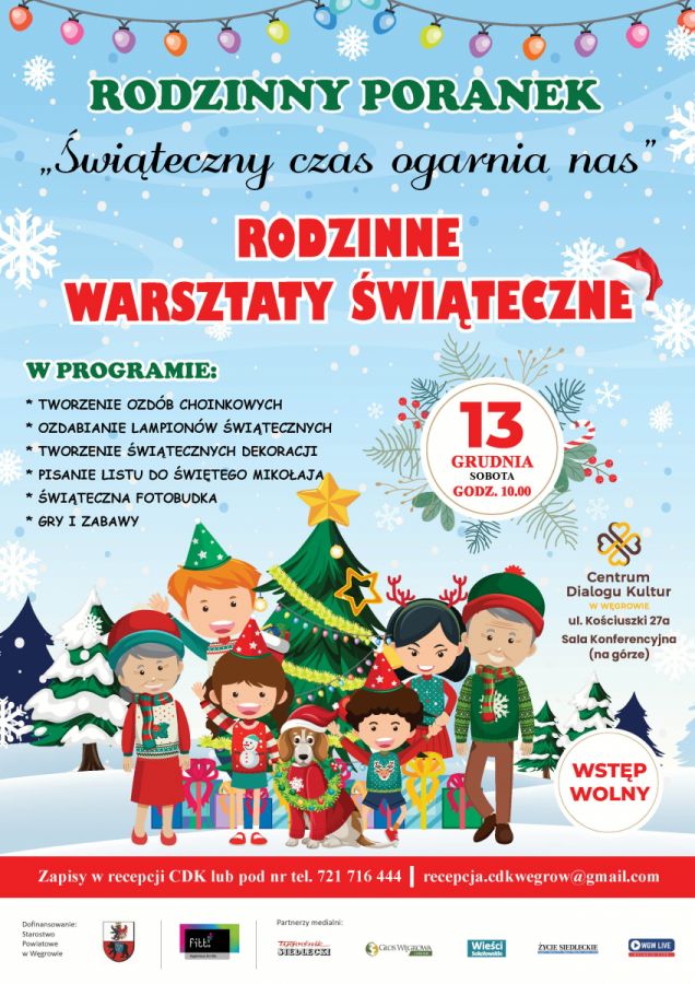 W sobotę 13 grudnia o godz. 10.00 zapraszamy na Rodzinny Poranek pt. „Świąteczny czas ogarnia nas - rodzinne warsztaty świąteczne".