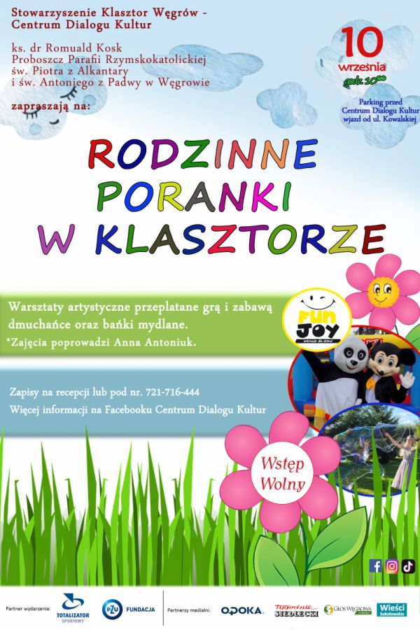 Rodzinne poranki w Klasztorze to kolejny nowy program naszego obiektu. Spotkania są bezpłatne i może na nie przyjść każdy kto lubi aktywnie spędzić wolny czas w super towarzystwie. Wszystkich zainteresowanych, którzy chcą spędzić sobotnie poranki z nami zapraszamy do śledzenia naszego profilu na Facebooku Centrum Dialogu Kultur tam będziemy informować na bieżąco o kolejnych spotkaniach. Partnerem wydarzenia jest Fundacja PZU oraz Totalizator Sportowy.