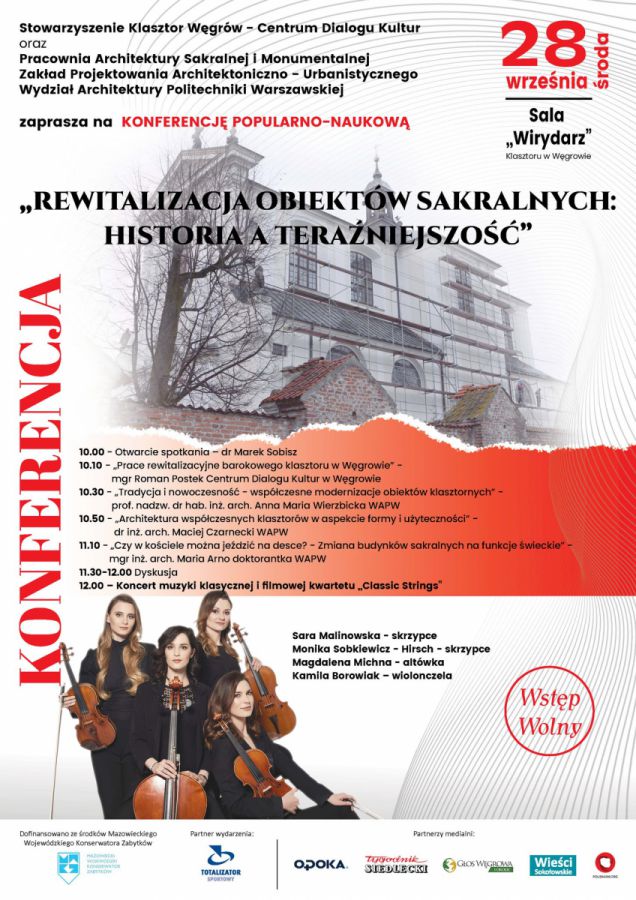 Stowarzyszenie Klasztor Węgrów - Centrum Dialogu Kultur zaprasza w dniu 28 września 2022 r. na Salę ,,Wirydarz” w Klasztorze na konferencję pn. ,,Rewitalizacja obiektów sakralnych: HISTORIA A TERAŹNIEJSZOŚĆ”. Spotkanie ma m.in. na celu ukazanie działań rewitalizacyjnych, jakie zostały podjęte podczas remontu zabytkowego obiektu z XVII /XVIII w. – dawnego klasztoru ojców reformatów w Węgrowie. Podczas konferencji będą poruszane również inne tematy związane z modernizacją obiektów sakralnych przedstawione przez naukowców z Wydziału Architektury Politechniki Warszawskiej.