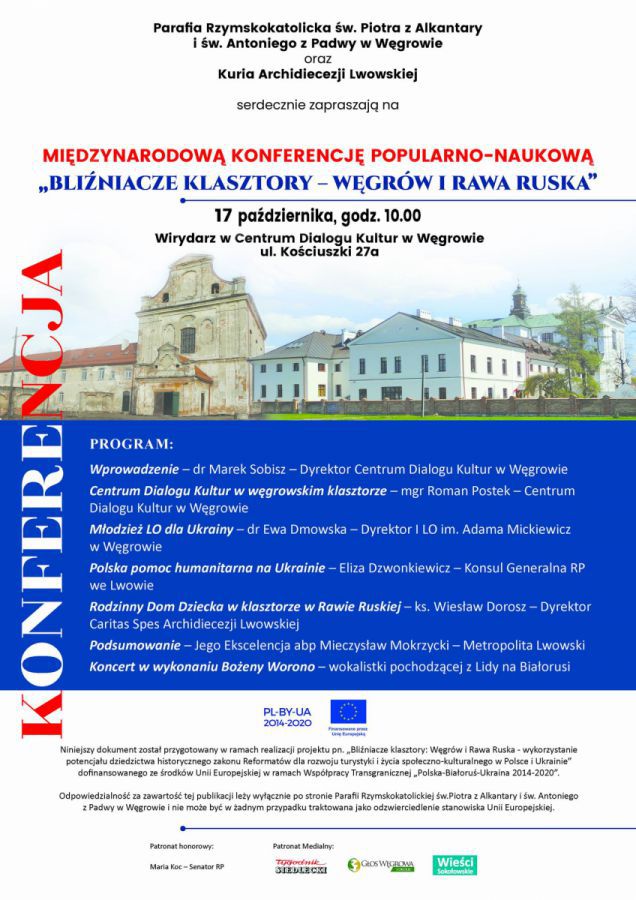 W najbliższy poniedziałek 17 października zapraszamy do klasztoru w Węgrowie na konferencję podsumowującą ponad dwuletnie partnerstwo między Polską a Ukrainą, między Parafią poklasztorną w Węgrowie a Archidiecezją Lwowską. Ta współpraca była możliwa min. dzięki Programowi Współpracy Transgranicznej CBC Programme Poland-Belarus-Ukraine. Podczas spotkania opowiemy, co udało się wspólnie zrobić, a także o nowych wyzwaniach jakie się pojawiły po zbrojnej napaści na Ukrainę przez Federację Rosyjską. Te wszystkie działania były możliwe dzięki społecznemu zaangażowaniu wielu mieszkańców Węgrowa, zwłaszcza młodego pokolenia.